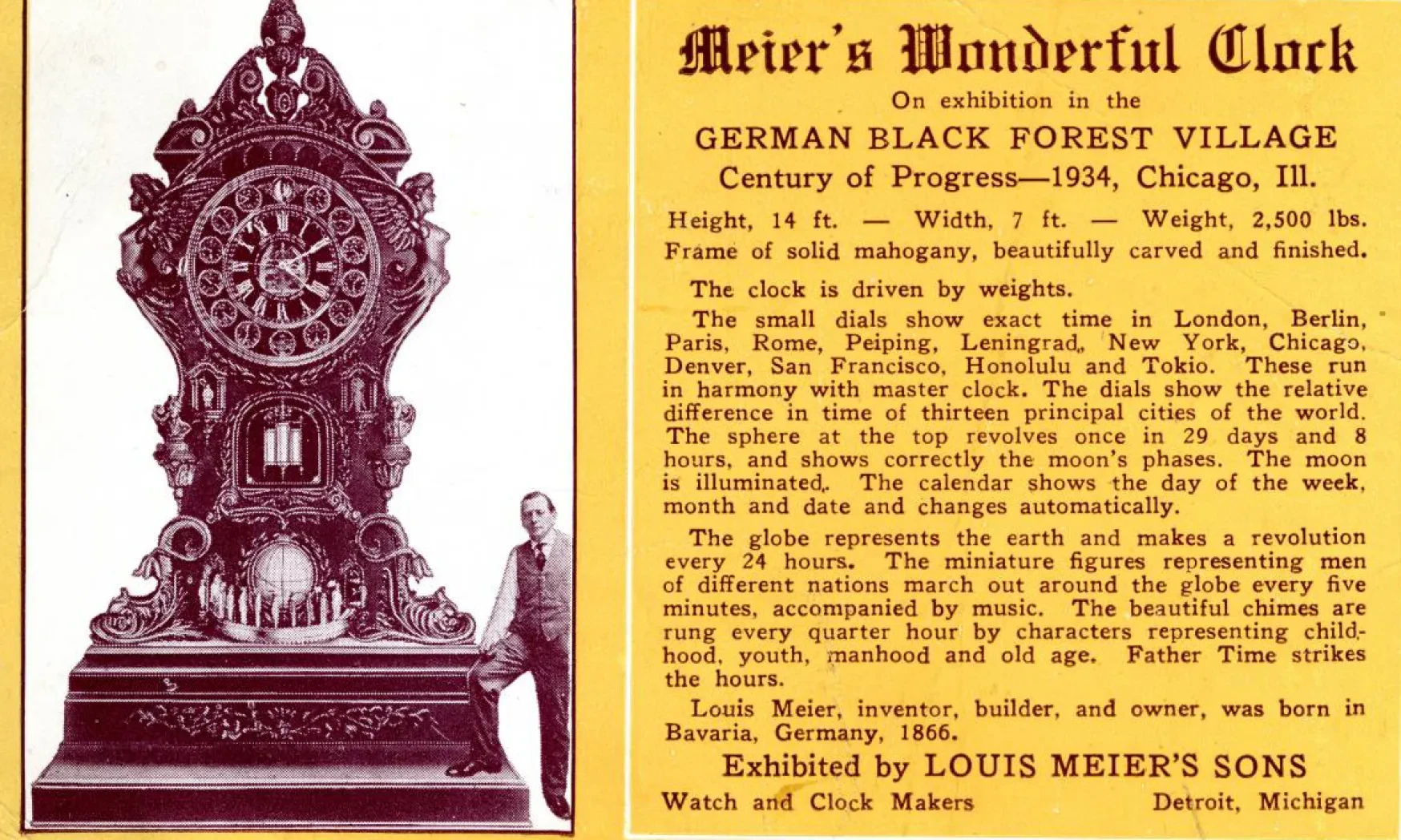 It took Louis Meier, Sr. twelve years to build his clock. Its hand-carved mahogany base, detailed glass clock face and intricate mechanisms made it a Detroit marvel when it debuted in his jewelry store at East Grand Boulevard and Gratiot Avenue in 1904.