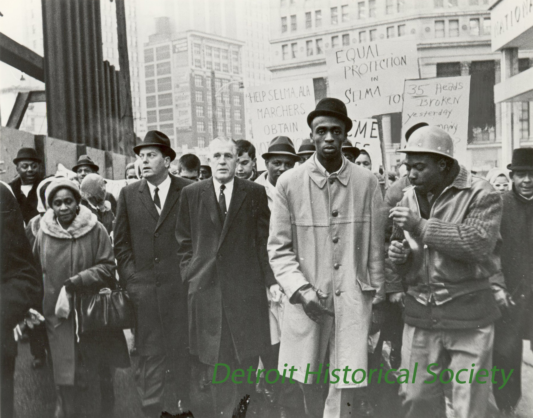 In 1965, Martin Luther King Jr. helped organize and lead a series of protests in Selma, Alabama. The "Selma to Montgomery" marches were important demonstrations that led to the 1965 Voting Rights Act, prohibiting racial discrimination in voting. The abuse of protestors in Alabama led to further demonstrations throughout the country. Detroit was no exception. The Rector of Sacred Heart Seminary, Monsignor Francis X. Canfield, led 400 students several miles to the Central Methodist Church where they were joined by an additional 9000 protestors. The march then proceeded to the Federal building, where leaders met with federal judge Lawrence Gubow. The picture from our collection above shows Governor George Romney and Mayor Jerome Cavanagh in the thick of the march at Fort Street and Woodward in front of the National Bank of Detroit, now known as the "Qube."