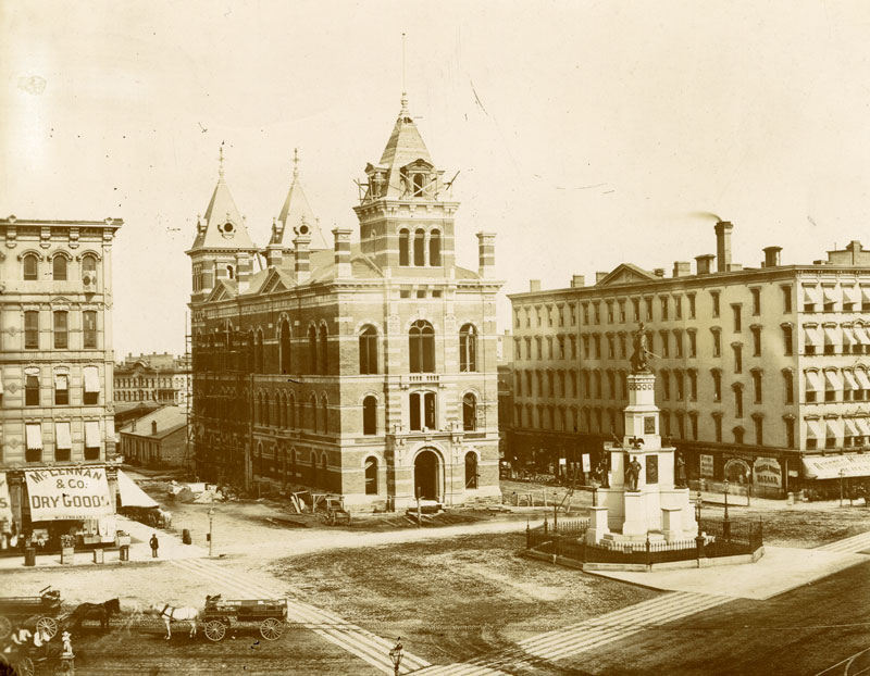 In the past we've mentioned Detroit’s original City Hall, which stood in what is now Cadillac Square. Prior to 1885, Cadillac Square was a street known as Michigan Grand Avenue, part of Augustus Woodward’s plan for rebuilding Detroit following the 1805 fire. In 1835, a section of this broad avenue was chosen as the site for Detroit’s first City Hall. This City Hall was a multipurpose building of sorts. The spot on Michigan Grand was conceived to contain both the City Hall as well as the Central Market, and as such the lower floor of the new building housed meat vendors. City officials could be found on the second floor, but so could theatrical performances and religious services. When the newer City Hall was dedicated in 1871 directly across Campus Martius, its smaller predecessor was briefly slated to become a library. Alas, it was decided it would be more cost effective to build a new library rather than convert the old city hall, and it was torn down in 1872.