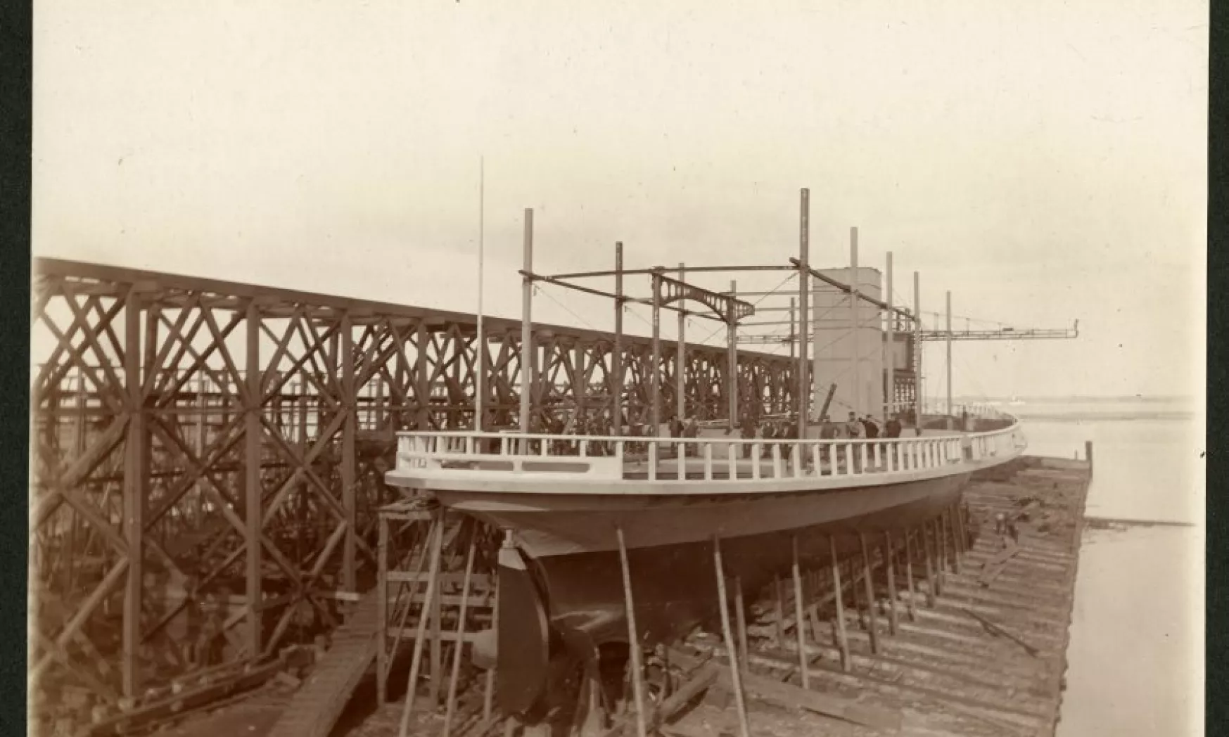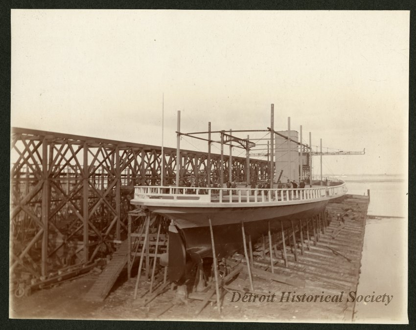 Photo: c. 1902, from the Detroit Historical Society collection. One sepia-toned photograph of the passenger ferry, SS Columbia, in dry dock at the Detroit Dry Dock Company. The view shows a starboard side stern view of the hull and main deck.