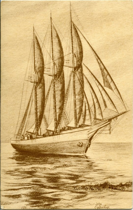 Photo: c. 1950, from the Detroit Historical Society collection. Monochromatic postcard depicting the J.T. Wing in full sail.