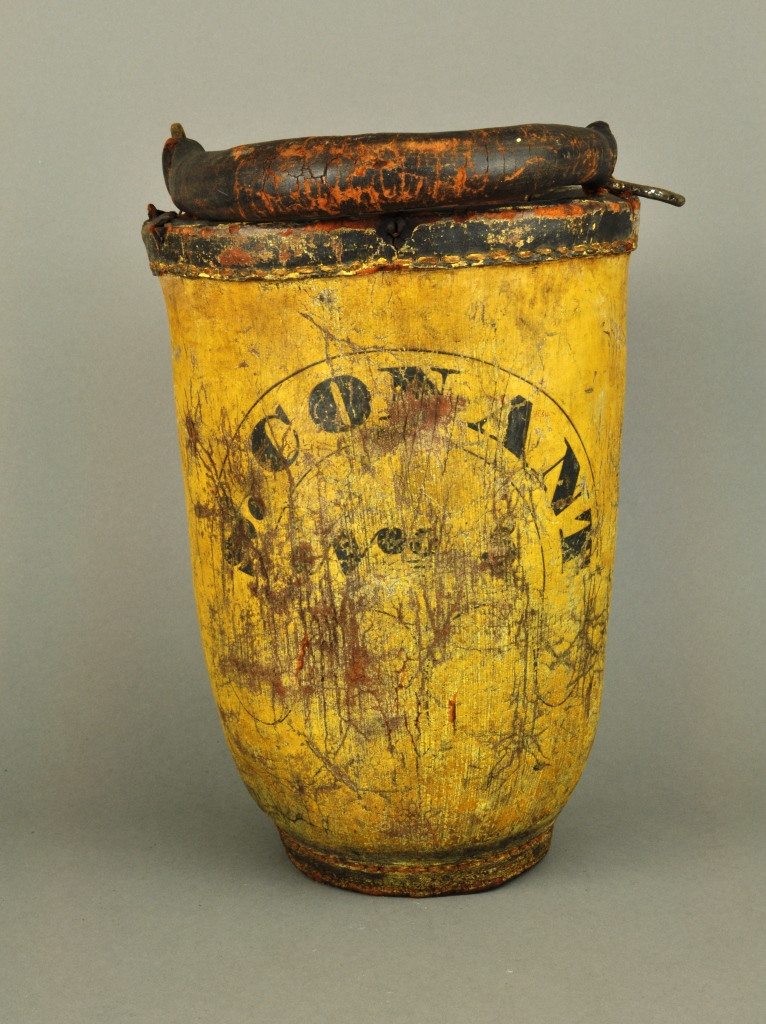 In the course of processing the biographical file of prominent Detroit figure Shubael Conant (1783-1867), I discovered two of Conant’s fire buckets. So what’s the big deal about buckets? Well, in 1836 the city adopted a resolution that required each building to have one 2.5 gallon fire bucket for every stove or fireplace. These buckets had to be marked according to standards outlined by the city, display the homeowner’s name and address, and be hung in a noticeable location at the entrance of houses. Conant himself was Chief Fire Warden of Fire Engine Company (Eagle) Number 2.