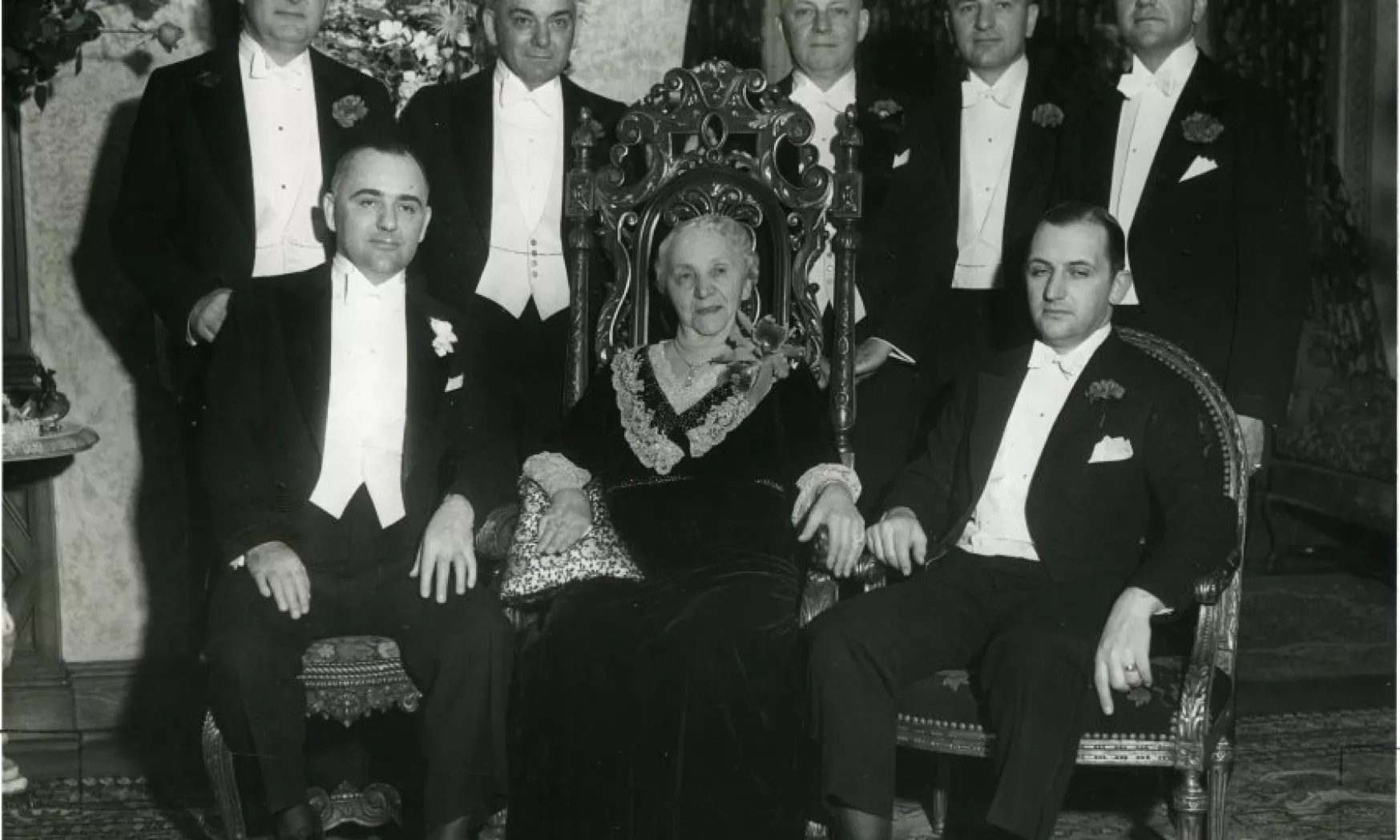 Photo: c. 1936, from the Detroit Historical Society collection. Black and white portrait photograph of the Fisher family take at Mrs. Margaret Fisher's birthday. Margaret is seated at center, surrounded by her seven sons. Standing (from left to right): William A., Frederick J., Charles T., Alfred J., Lawrence P. Seated (from left to right): Edward J., Margaret, Howard A.