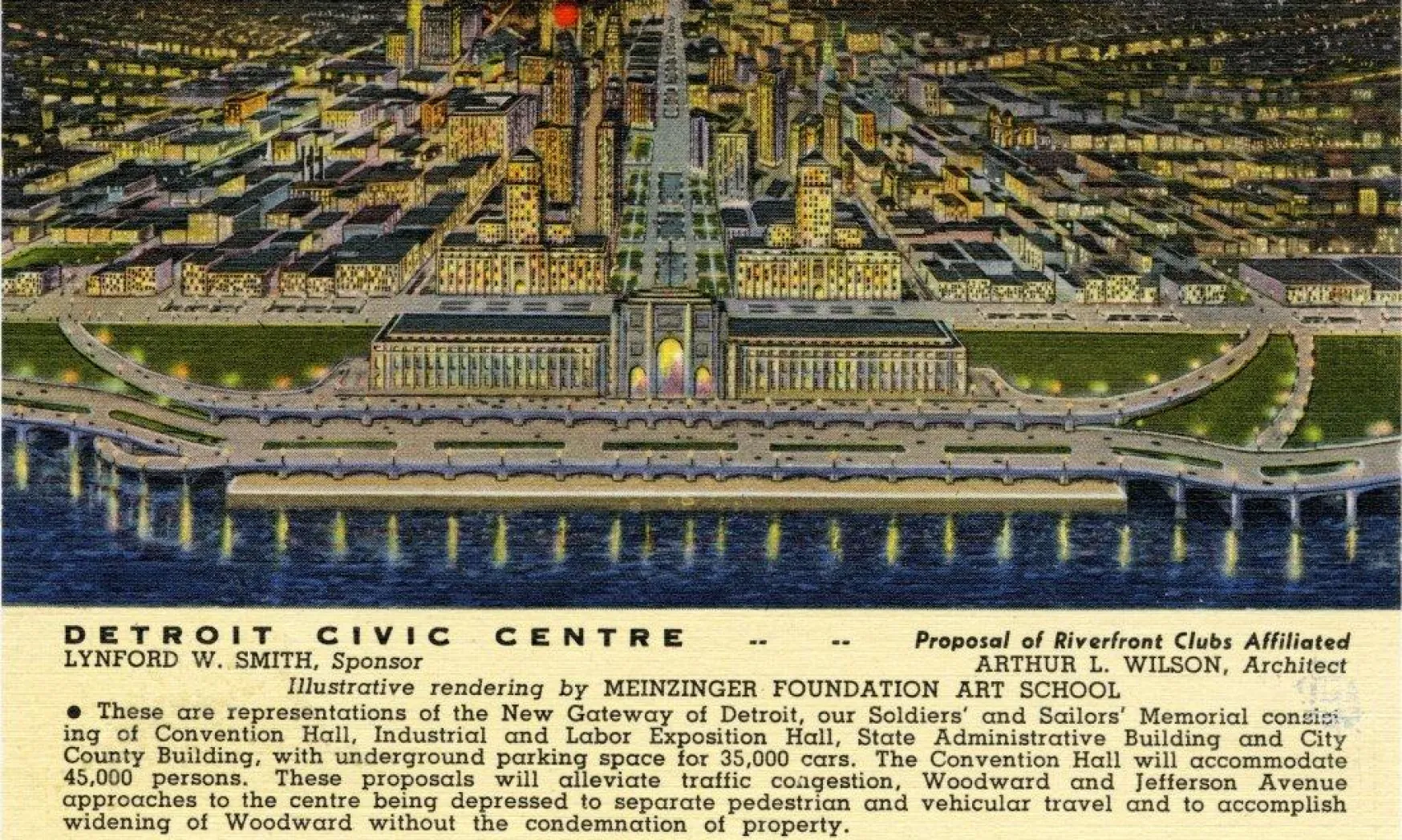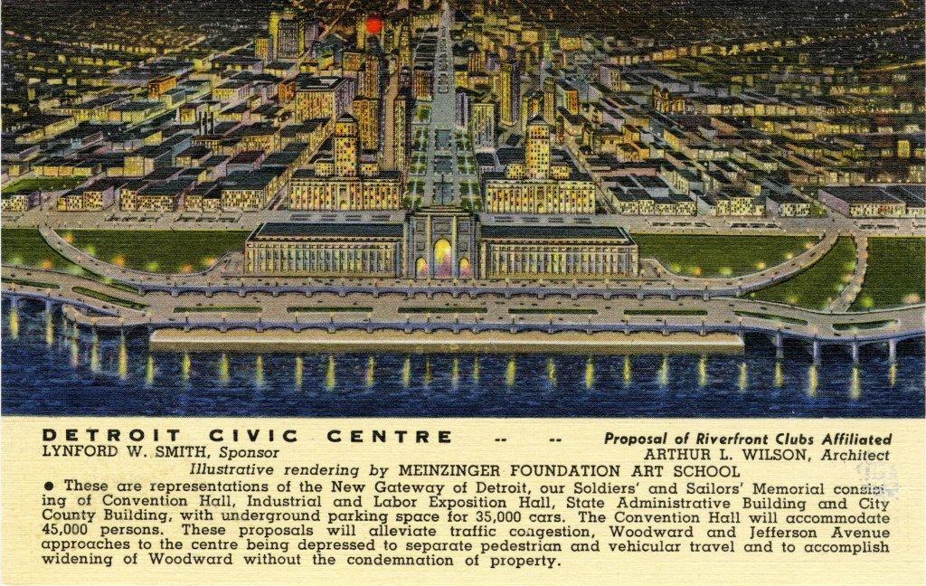 The most elaborate is probably a design for the “New Gateway of Detroit,” presented on a postcard which was mailed out to promote a slate of Democratic candidates in 1938 by delegate James P. Keenan. Keenan and another of the listed candidates were on the committee behind the plan. The plan called for a wide building to be constructed along the riverfront, south of Jefferson Avenue. Across Jefferson, the mouth of Woodward Avenue would be flanked by identical buildings on each side. The card does not explain which building is which, but does state the plan involved a convention hall, industrial and labor exposition hall, state administration building, city county building, and an underground garage. If the waterfront building was to be the convention center, it makes an interesting parallel to Cobo Center, which would be built to the west 22 years later. Likewise it is tempting to think of the twin buildings as the state and city buildings, whereas the Coleman A. Young Municipal Center now serves a similar role in the footprint of just the east tower.
