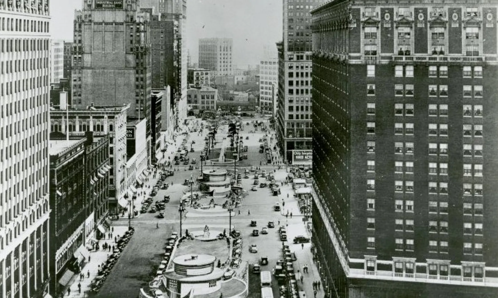 With all the changes Washington Boulevard has gone through, of course there were plenty more ideas which were abandoned. Postcards, seemingly from another universe, show both the non-existent Aviation Town and Country Club Building, and the Book Tower we know dwarfed behind an even larger Book Tower on the southern end of the Book Building. The back of the Book Tower card boasts that the structure is 873 feet tall, 81 floors, and the tallest building in the world with no hint that the structure did not yet exist, and due to the Great Depression, would never. Had it, it would tower over a hundred feet above the Renaissance Center. Below at street level, Washington Boulevard, prior to the red tube-lined pedestrian mall, was proposed as an entrance to an underground parking structure in a 1946 photo composite. And as the city continues to change, we will continue to see plans for Detroit which will get left by the wayside for better or worse. Will future Detroiters view the animation of the Woodward Avenue Light Rail Project or concept art of the Cadillac Centre the same we see the 873 foot tall Book Tower, or will they simply see an early incarnation of a piece of their world?