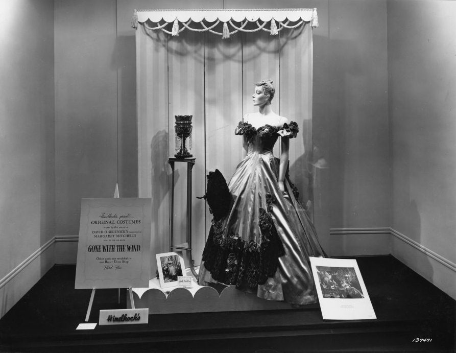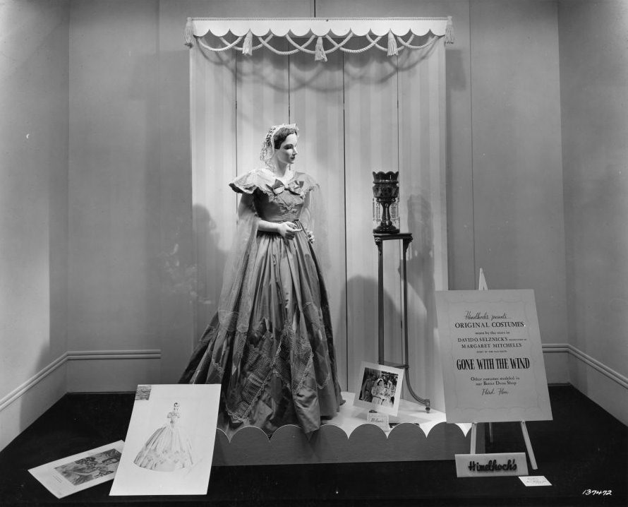 Glitz, grandeur, and glamour were a staple of Hollywood’s Golden Age, but Detroit had its own examples of Hollywood flair. Downtown streets have a long history of highly stylized window displays featuring the latest fashions, but on occasion shoppers were treated to something extra special. Gone with the Wind, David O. Selznick’s cinematic epic starring Clark Gable, Vivien Leigh, and Olivia de Havilland made its own unique appearance at Himelhoch’s Department Store, once in business on Woodward Ave. between Clifford St. and Park Ave. When Gone with the Wind premiered to Detroit’s viewing public at the United Artists Theatre in 1940, the people of Detroit did not know they would also receive an elaborate treat. Appearing in the windows and on the third floor, modeled in the Better Dress Shop, were displayed the very costumes from the film for everyone to admire.