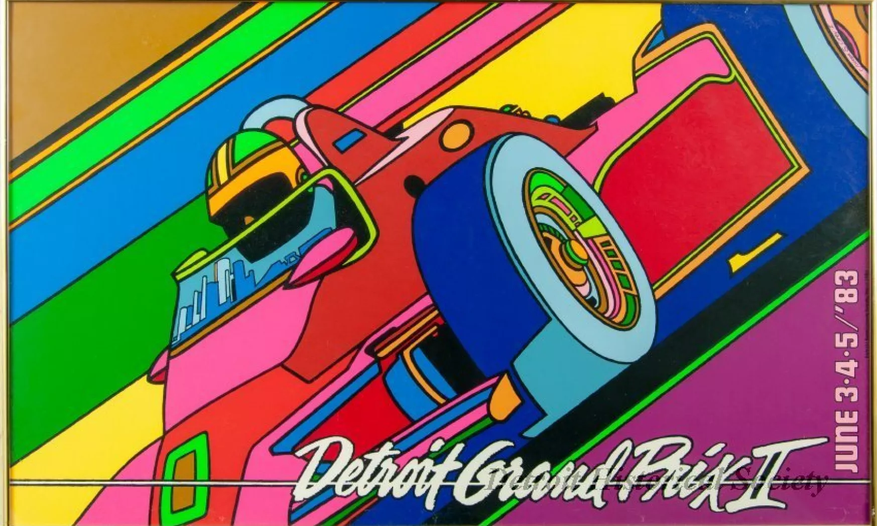 Joseph E. Grey II provided the poster for the 1983 race. An Ohio native, Grey is perhaps best known for his Cubist watercolors which employed the same broad patches of bold color on display here. He eventually settled in Michigan, got into advertising, and by the 1980s was senior art director for Lintas: Campbell-Ewald Advertising. Look closely and you’ll spot the Renaissance Center and The Horace E. Dodge and Son Memorial Fountain reflected in the car’s windshield.