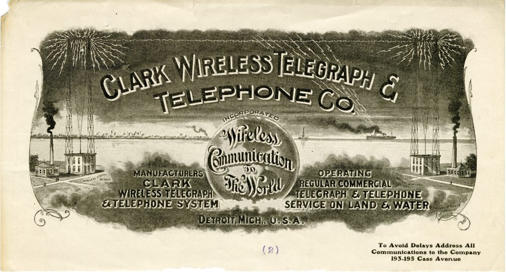 This c. 1905 advertisement for the Clark Wireless Telegraph and Telephone Company fancifully illustrated wireless communication between stations in Detroit, Buffalo, and a ship on Lake Erie. Clark’s company eventually changed its name to Tecla, which still continues today, although with a focus on pet toys and fishing supplies rather than radio equipment.