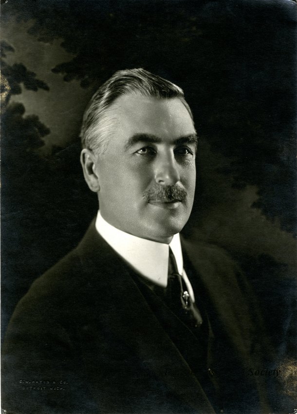 Photo: c. 1920, from the Detroit Historical Society collection. Sepia-toned head and shoulders portrait photograph of a William Metzger. He is wearing a dark suit and vest, white shirt, and a dark tie with a stickpin.