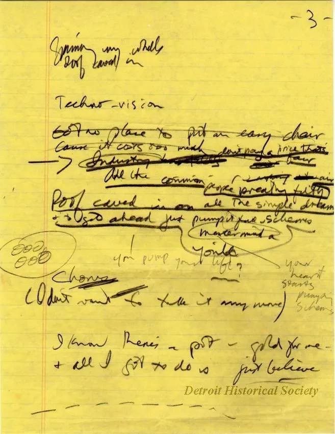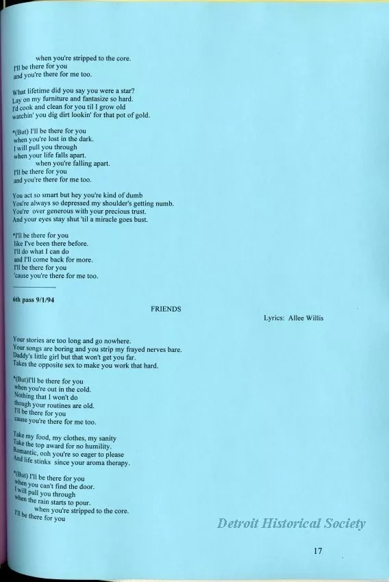 Nestled within the archives of the Detroit Historical Society are a pair of surprising pop culture artifacts--copies of the draft lyrics for both the theme song of the 90s T.V. hit Friends, and for the Pointer Sisters’ 1984 single “Neutron Dance.” The Detroit connection for these two songs may not be readily apparent to many, but if you check the sleeve of your well-worn copy of the Pointer Sister's album Break Out, and pay close attention to the end credits of Friends, you’ll find the common factor is proud Detroit native Allee Willis. Willis’ signature works may be her collaborations with Earth, Wind, and Fire, including their funk classic “September.” However she has worked with a myriad of other artists, ranging from Bonnie Raitt to DMC, and Patti LeBelle to the Del Rubio Triplets. In fact, you very well may have recently joined Willis as one of the 5,000 Detroiters who contributed their voices to her recent anthem for the city, “The D,” which she recorded over the course of five years at various events across the area, including stops at both the Detroit Historical Museum and the Dossin Great Lakes Museum. Willis, hot on the heels of being honored with a Distinguished Detroiter award at the 2018 Detroit Music Awards, agreed to answer a couple questions for our blog about the draft lyrics, her creative process, and her other works.