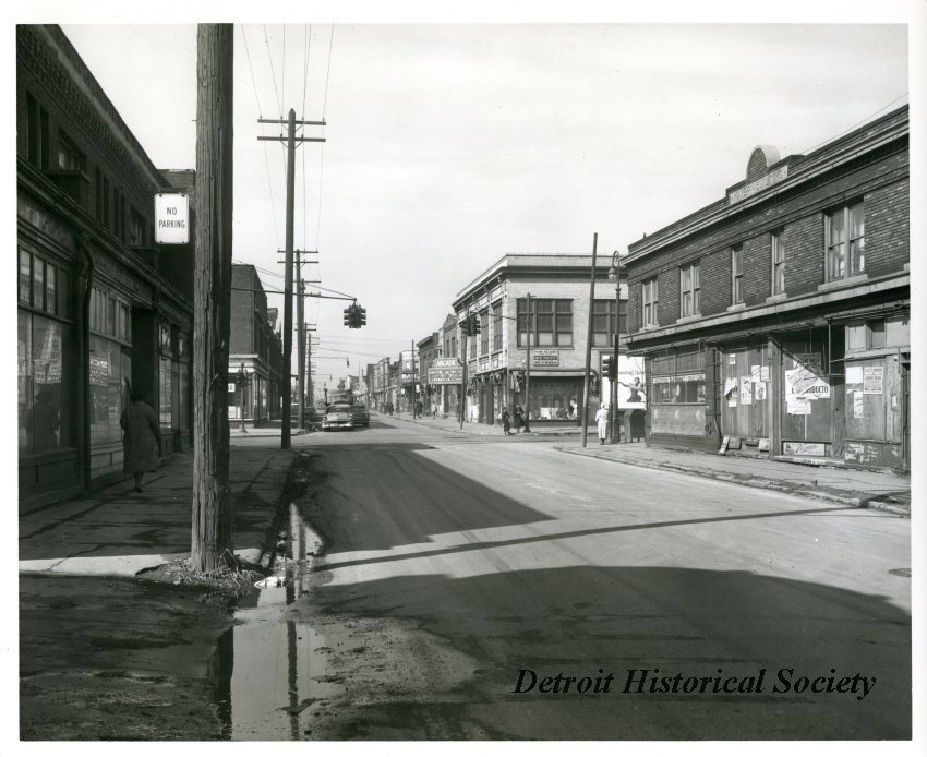 Photo: c. 1959, from the Detroit Historical Society collection. Black & white photograph depicting a view along Hastings Street, looking north towards the intersection of Vernor Highway.