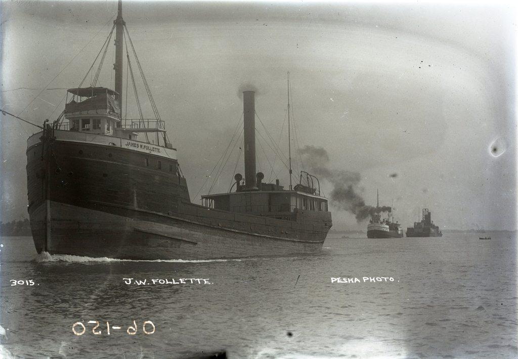 The wooden steam barge JAMES W. FOLLETTE approaches as another early freighter follows with a barge in tow.