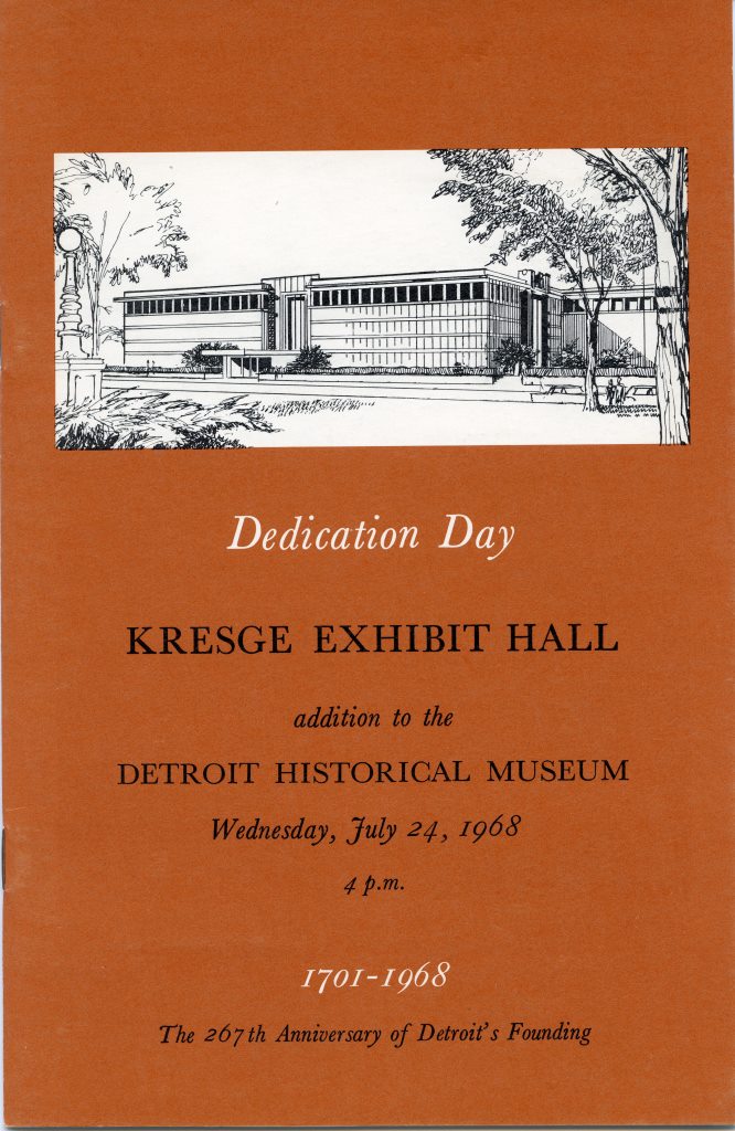 In 1966, the foundation was excavated and the new Kresge addition was underway. The architectural firm of Smith, Hinchman & Grylls, which had designed and built several Detroit landmarks including the Penobscot Building and J. L. Hudson Department Store, was hired to build an addition that matched the existing architecture by William E. Kapp. After two years, the addition was complete. On July 24, 1968, 17 years to-the-day of the original museum dedication and on the city’s 267th birthday, the addition was dedicated “to the enjoyment and enrichment of the citizens of the Detroit area, for the further appreciation of our heritage.” Today, the Kresge addition houses Wrigley Hall, the Louise Booth Auditorium, Booth-Wilkinson Gallery and the Frontiers to Factories and Doorway to Freedom exhibitions. You can see more images and artifacts from the Society, including more construction and dedication photographs in our online collection.