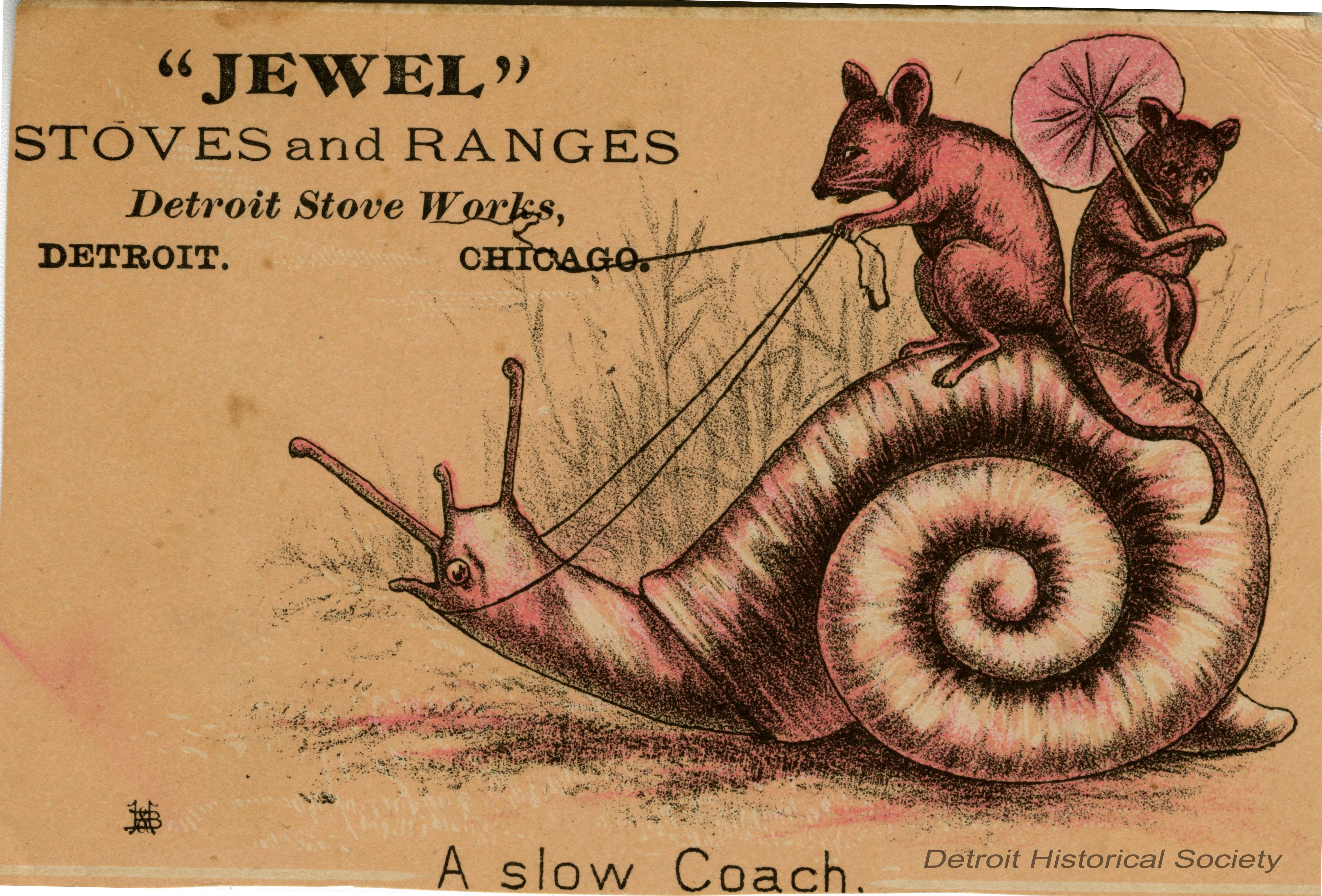 Even before the rise of its automobile industry, Detroit was a major manufacturing center. The city's foundries and factories were fueled by Michigan’s abundant mineral resources and forests, combined with access to materials from the Great Lakes shipping lanes. A key industry in Detroit during this time was stove and furnace manufacturing, headed by the original "Big Three:" Detroit Stove Works, Michigan Stove Company, and Peninsular Stove Company. At the turn of the twentieth century, Detroit was the world's stove manufacturing capital. Competition between stove manufacturers was fierce, requiring companies to constantly innovate and market their products to stay in the game. A common form of marketing put out by these companies was trade cards, small paper cards usually featuring illustrations or lithographs on their front and advertisements for specific stove brands, models, or companies on their backs. Some illustrations and lithographs were simple stock images with stove company logos, but others featured specially commissioned images of stoves with company slogans (designed by companies such as Detroit's Calvert Lithographing company). These images ranged from amusing to sentimental in character, being chosen to best catch the attention of potential customers and increase brand awareness. The advertisements on the back of trade cards would announce new models, promote specific brands such as the Detroit Stove Works's Jewel Stoves and Ranges, and give directions to stores which sold stoves and furnaces. Trade cards are examples of early mass-marketing, being produced and distributed at prodigious rates and effectively spreading awareness of the companies and products of industries. They were also early examples of keepsakes and collectibles put out by companies. Even when recipients did not buy the products these cards were advertising they often kept the cards upon their mantles or placed them in scrapbooks. They offer a window into the business and popular art sensibilities of their time, and are often still in good condition a century later. The Detroit Historical Society maintains an extensive collection of trade cards, and other materials, from Detroit’s stove companies and other businesses, accessible via its online collection and by request.