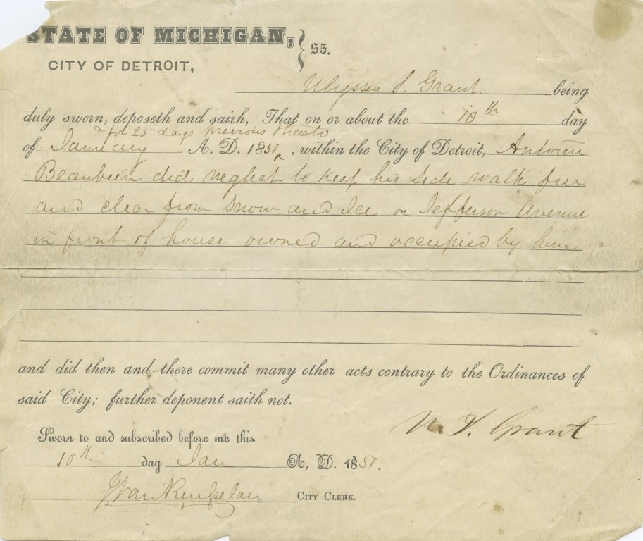 Before being elected as president of the United States, and before becoming a General in the Union Army against the Confederates in the Civil War, young Lieutenant Ulysses S. Grant served as a quartermaster living in Detroit from 1849-1851. The Grant House at the Michigan State Fairgrounds was a popular attraction for many years. The house was originally located on Fort Street near Livernois Avenue. Grant and his new wife were well-known around town and quite sociable. Little is known about Grant during his brief time in Detroit. Colonel James Pitman offers the most complete picture of Grant’s character. Pitman writes “U.S. Grant was at that time a familiar figure in Detroit society. A man as well known as any residing in the city at that time.” One small bit of evidence exists in the collection of the Detroit Historical Society that proves a little of Pittman’s opinion of Grant’s stature in the community. On January 10, 1851, Grant signed a deposition claiming that Antoine Beaubien Jr. failed to clear the snow and ice from the sidewalk in front of his house on Jefferson Avenue at Antoine Street.