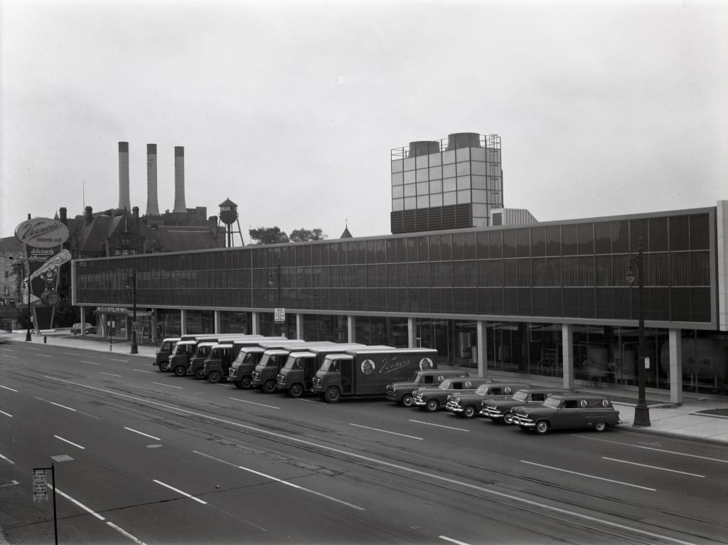 Vernor’s Ginger Ale has long been a Detroit tradition, but the company’s former headquarters was strikingly modern for its time. In the 1950s, the city decided that Vernor’s riverfront locale was in the way of redevelopment. Since part of that redevelopment was Cobo Hall, there was no longer a need for the outdated Conventional Hall along the west side of Woodward Avenue between Canfield and Forest Streets. Vernor’s jumped at the opportunity to swap land and construct a sparkling new plant on this larger site. Opening in 1954, the Harley, Ellington and Day design was a showcase for the popular modern architectural movement with its glass walls, clean lines and linearity.