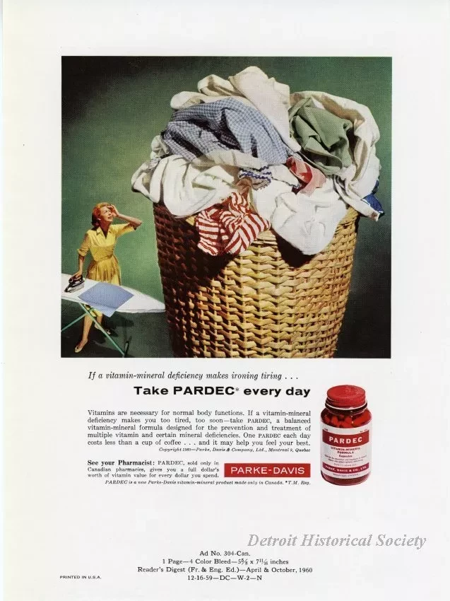Color print advertisements for Pardec, a multivitamin produced by Parke-Davis. It depicts a woman ironing next to an oversize basket of laundry.