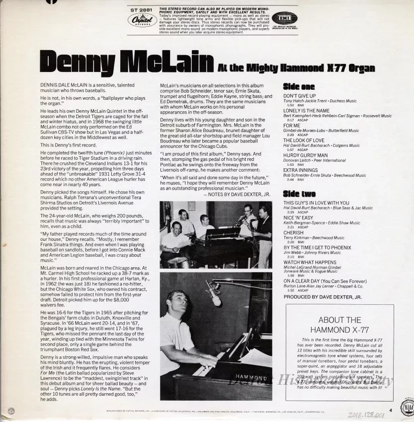 McLain is featuring on the cover in his Tigers uniform on the pitching mound. The rear of the jacket includes a pair of photos from the recoding sessions, as well as notes written by Dave Dexter, Jr.