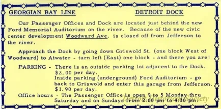 One "Georgian Bay Line Detroit Dock" notice concerning the company office location, office hours, and parking. The notice is printed in blue text on a small sheet of pale yellow paper.