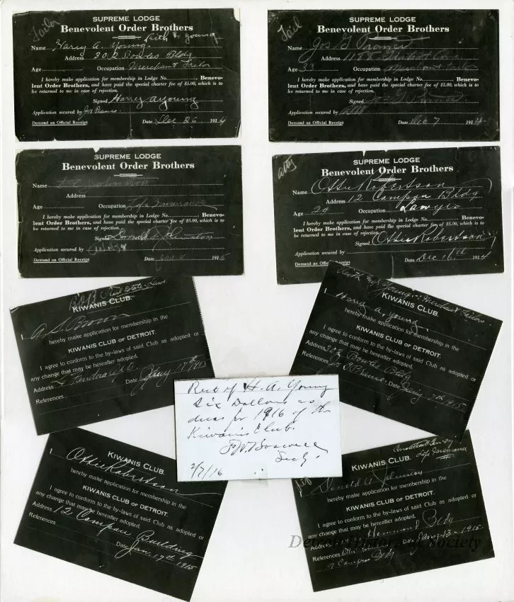 1 - Display board of facsimile images (8 negatives, 1 positive) of early Kiwanis Club membership application forms. The application forms read "Supreme Lodge, Benevolent Order Brothers" or "Kiwanis Club" at the top and have blank lines that have been completed in handwritten text. The Supreme Lodge forms are all dated 1914 and the Kiwanis Club forms are dated 1915. Member names include: Harry A. Young, A. S. Brown, Donald A. Johnston, Joseph G. Prance, and Ossie Robertson. It appears that the members of the Supreme Lodge, Benevolent Order Brothers of 1914 became the Kiwanis Club members of 1915.