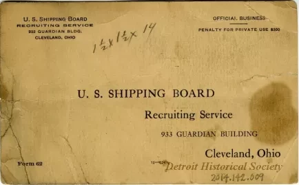 Registration postcard for the Merchant Marine, filled out on the verso by Lorne James Wood of Detroit, and addressed to the U.S. Shipping Board Recruiting Service office in Cleveland, Ohio on the recto.