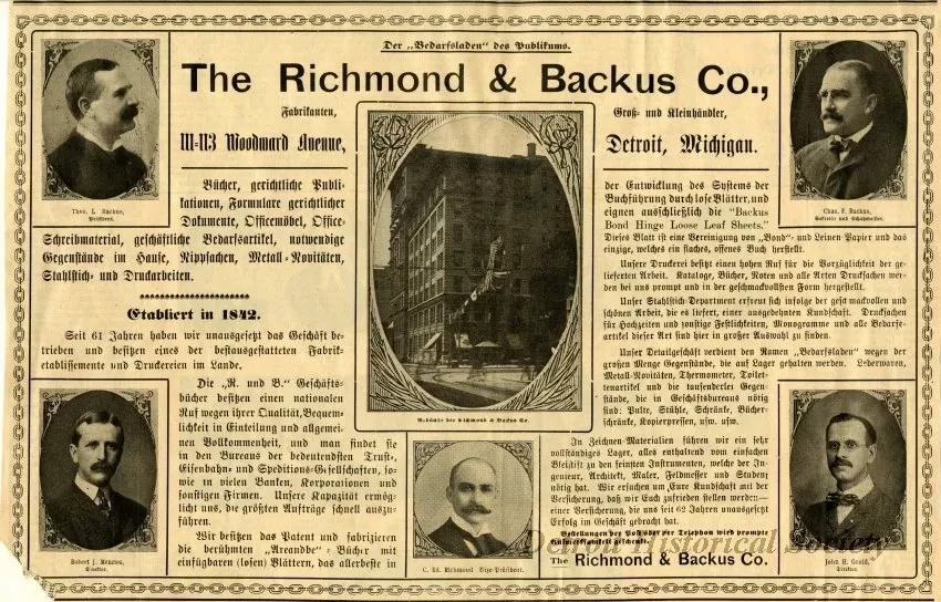 One sheet, taken from the Michigan Volksblatt in 1903, featuring an article about the Richmond & Backus Co. The article is written in German. The article also features six inset photographs. One photograph, in the center, depicts the Richmond & Backus Co. Building, and five photographs feature the following individuals, clockwise from top left: Theo L. Backus, Chas. F. Backus, John H. Gould, C. Ed. Richmond, and Robert J. Menzies. The article is outlined in a decorative chain link border. Mounted on paper.