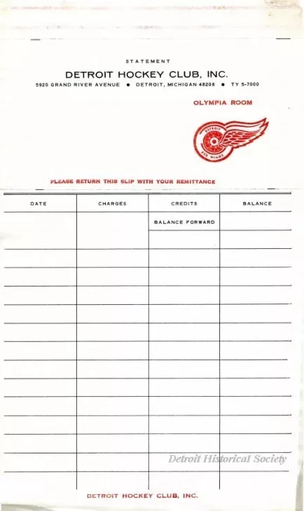 Request ImageDetached pad of blank bills from the Olympia Room at Olympia Stadium. Made up of white, carbon, and yellow sheets. Header reads, "Detroit Hockey Club, Inc."