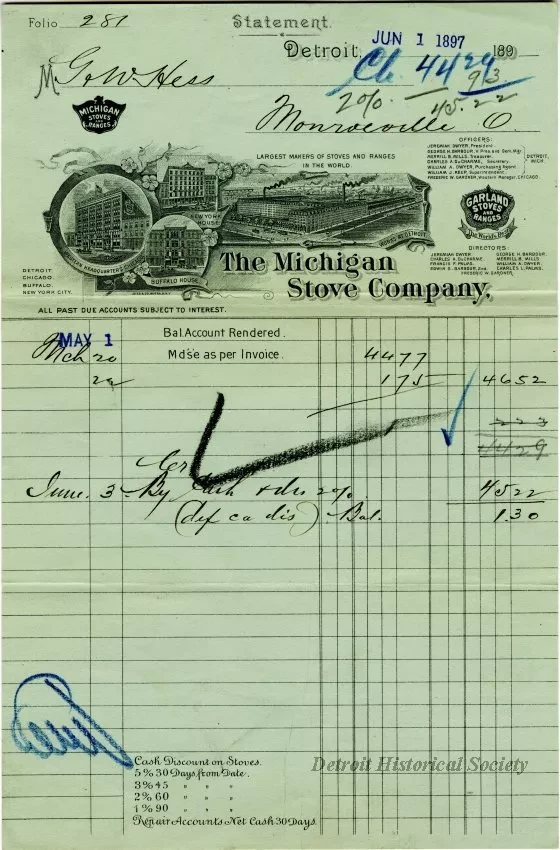 Bill of sale, dated June 1st, 1897, from the Michigan Stove Company, documenting the sale of a Garland stove to G.W. Hess of Monroeville, Ohio. At the top of the bill are images depicting the Michigan Stove Company's stove works in Detroit, Western Headquarters in Chicago, Buffalo House, and Garland Stoves and Ranges logo.