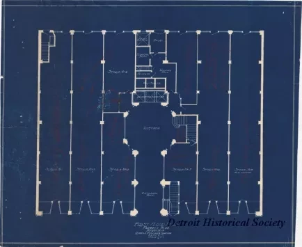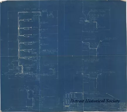 Blueprint drawings showing various views, floor plans, revisions, and proposed alterations to the Farwell Building in Detroit: