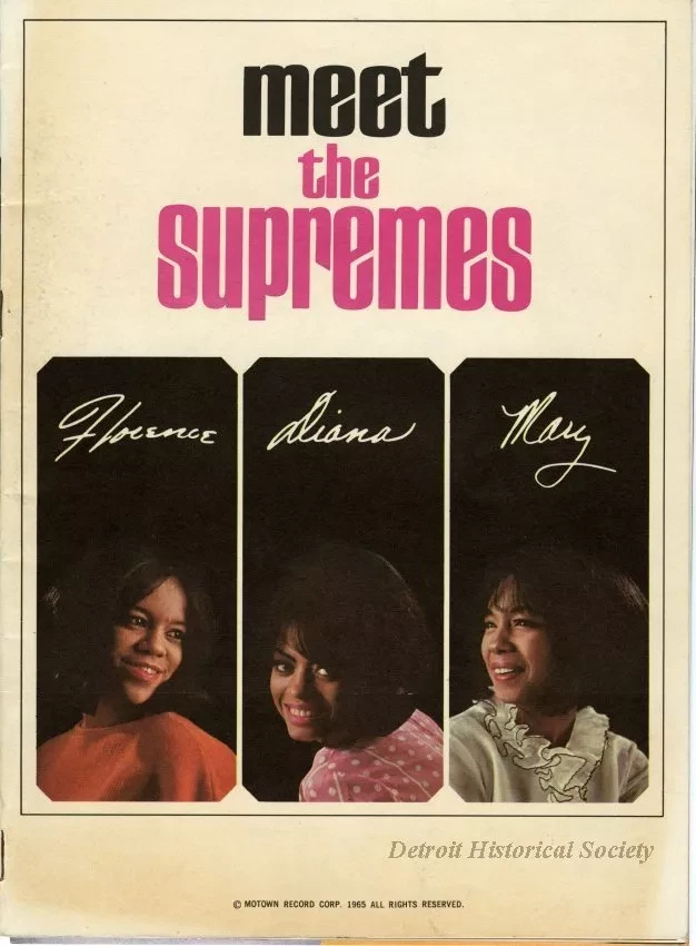 Booklet entitled "Meet the Supremes," released to coincide with the 1965 reissue of their album by the same name. Florence Ballard, Diana Ross, and Mary Wilson are pictured on the cover in separate panels. Color and black and white photos are contained within along with a brief biography of the group including mentions of Wilson's interest in linguistics, and Ballard's love of bowling.