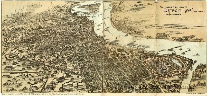 Four panel brochure promoting the Detroit International Exposition and Fair held from September 17th to the 27th of 1889. The recto bears a color Calvert Lithograph Company illustration of Detroit, as viewed from the air above Delray, facing northeast, captioned "All Roads Will Lead to Detroit in September. Why? (see over)." The exposition site, containing the large Main Building, several smaller structures, and two ponds, is at the lower right corner of the image, to the west of Fort Wayne. The Detroit, Lansing and Northern Railroad; Detroit and Bay City Railroad; Michigan Central Railroad; Lake Shore and Michigan Southern Railway; Wabash Railroad; Detroit Grand Haven and Milwaukee Railway; Belt Line; and Lake Erie, Essex and Detroit River Railway lines are all labeled, as are the communities along the Canadian side of the Detroit River--Walkerville, Windsor, Sandwich, and Mineral Spring.