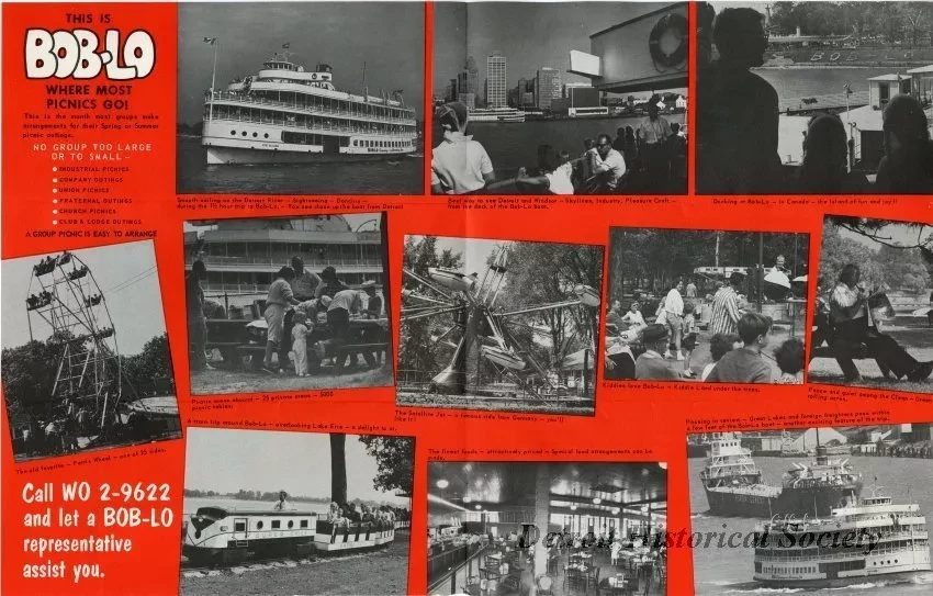 Box A, Folder 7 - Bob-Lo Excursion Company - Publications - "For Your Picnic Outing --- You'll Like Bob-Lo" brochure promoting Boblo Island as a destination for group picnics. The red cover has a red hexagon shape with a color aerial photo of the COLUMBIA. Inside are 11 B&W photos of island activities and boats. A map of the island, and bullet points of the island's suitability for group picnics are on the back - one fold, printed, illus. l. 1940s