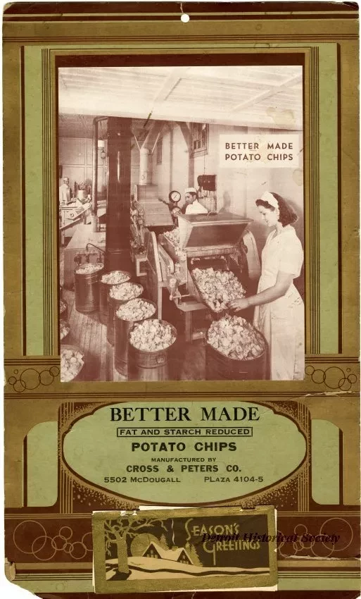 Better Made Potato Chips promotional calendar for the year 1940. The calendar features a half-tone image of a woman and two men working on a potato chip assembly line among several barrels of chips, surrounded by a green and gold border. "Better Made Fat and Starch Reduced Potato Chips, Manufactured by Cross & Peters Co., 5502 McDougall, PLaza-4104-5" is printed below the image. At the bottom of the sheet, a small rectangular calendar is stapled to the backing. The front page of the calendar reads "Season's Greetings," beside an image of a snow-covered house.
