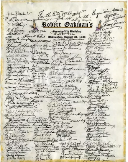 Signature sheet for Robert Oakman's seventy-fifth birthday on Wednesday, August 21, 1935.