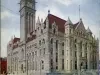Card, published by the Curtis Advertising Company, bearing a colorized half-tone photo of the Federal Building and Post Office on the west corner of Fort Street and Shelby Street, as taken from the east. The building is depicted as having grey walls, and a red roof. "Curtis Adv. Co., Detroit, The Post office, In Detroit--Life is Worth Living," is printed along a yellow strip along the bottom edge of the card. A hole is punched in the top of the card.