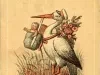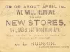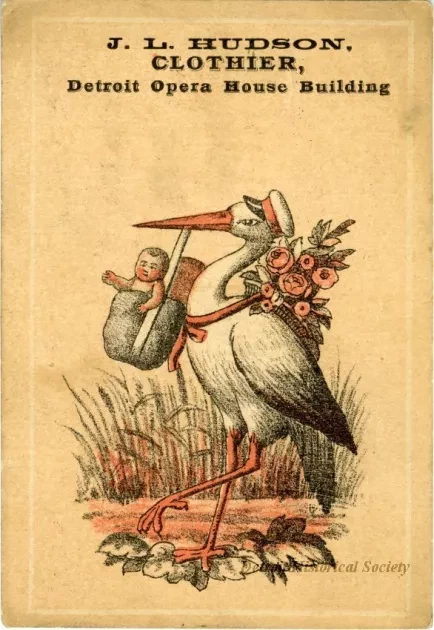 J.L. Hudson trade card advertising the company's move from the Detroit Opera House building, to their new location at 141, 143, and 145 Woodward Avenue. The recto is printed with an image of a stork walking with a bag in a bag hung from his bill, a bouquet of flowers on his back, and a white peaked hat on his head. "J.L. Hudson, Clothier, Detroit Opera House Building," is printed along the top. The verso is printed with the text, "On or about April 1st we will remove to our new stores, 141, 143 &145 Woodward Ave. where we shall be pleased to receive our Friends and Customers. J.L. Hudson." "Selma" and "Beer" are handwritten on the verso in pencil.
