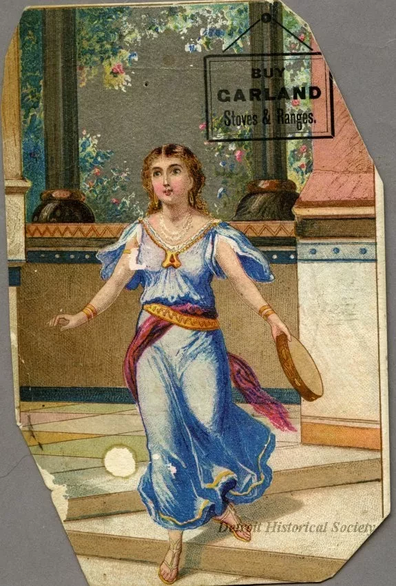 Trade card from the Michigan Stove Company advertising Garland Stoves and Ranges. A lithograph on the recto depicts a woman in a blue dress, with a purple sash around her waist, holding a tambourine while going down a set of steps. A Garland Stoves and Ranges logo is printed on the verso, along with a stamp that reads "Sold by Adam J. Orth, 190 Hastings St."