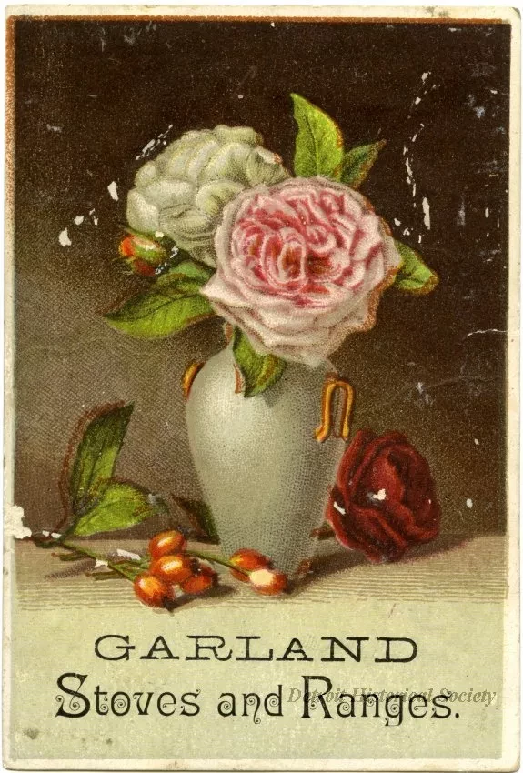 Trade card from the Michigan Stove Company advertising Garland Stoves and Ranges. A lithograph on the recto depicts a vase of flowers, containing one pink flower and one white flower, sitting upon a surface with a red rose lying horizontally behind it. "Garland Stoves and Ranges" is printed across the bottom of the recto.