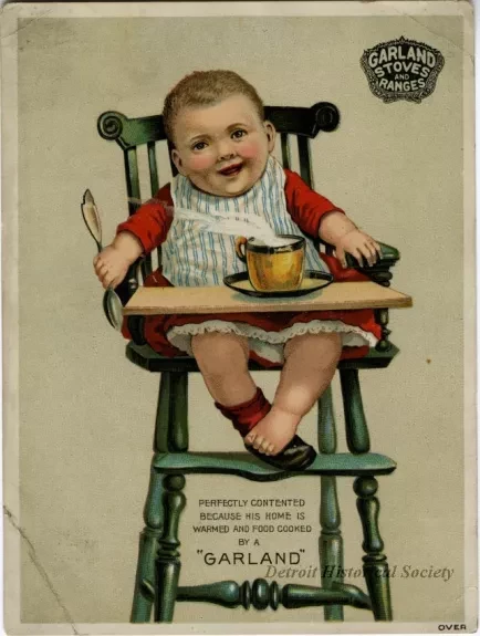 Trade card from the Michigan Stove Company advertising Garland Stoves and Ranges. An image of baby holding a spoon and laughing in a high chair with a steaming cup of food on its tray with caption "Perfectly Contented Because His Home Is Warmed And Food Cooked By a Garland" is printed on recto. An advertisement for the "Novel-Garland" model stove is on the verso.