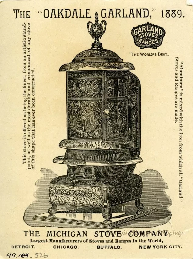 Trade card from The Michigan Stove Company advertising Garland Stoves and Ranges. An image of baby holding a spoon and laughing in a high chair with a steaming cup of food on its tray with caption "Perfectly Contented Because His Home Is Warmed And Food Cooked By a Garland" is printed on recto. Advertisement for the Garland "Oakdale Garland, 1889" model stove on verso.