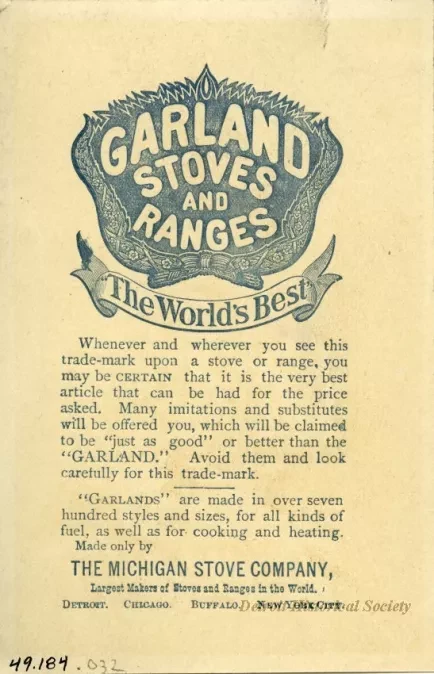 Trade card from the Michigan Stove Company advertising Garland Stoves and Ranges. A color lithograph, credited to G.H. Dunston Lithograph of Buffalo, N.Y., of a woman in a red blouse with a white shawl, white skirt, and white gloves holding a fan is printed on the recto. An advertising passage stressing the importance of purchasing genuine Garland Stoves and Ranges as opposed to imitators and substitutes is printed on the verso.