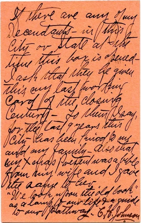 "If there are any of my descendants in this city or state at the time this box is opened, I ask that they be given this, my last working card of the closing century. To them I say, for the last 9 years, this city has been kind to me and my family. Also that my Xmas present was a Bible from my wife and I gave the same to her. We look upon the 'old book' as a lamp to our life and a guide to our pathway. C. H. Johnson."