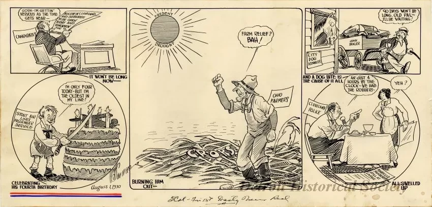 Newspaper cartoons done in ink on heavy paper. The sheet features five separate cartoons. The cartoon at bottom left is titled "Celebrating his Fourth Birthday" and shows a boy, labeled "Stout Air Lines Passenger Service," cutting a cake topped with an airplane, and saying "I'm only four today - But I'm the oldest in my line!"