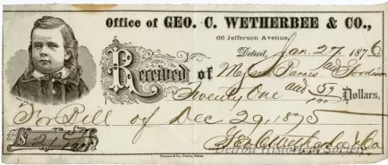 Check, printed by Thompson and Company, from the office of George C. Wetherbee and Company to Barnes and Goodison for $21.59, dated Jan. 27, 1876. An illustrated head-and-shoulders portrait of a child credited to the Michigan Engraving Company, is printed in the upper left corner.