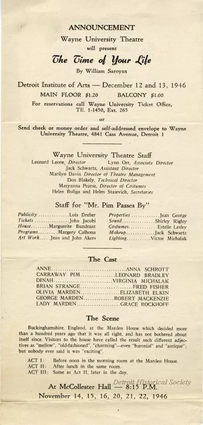 Folded triangular table tent or mailer advertising a production of "Mr. Pim Passes By," at the Circular Theater in McCollester Hall. The interior unfolds containing an announcement for a production of "The Time of Your Life" at the Wayne University Theatre in the Detroit Institute of Arts auditorium on December 12th through the 22, 1946 with preview performances at McCollester Hall from November 14th through the 22nd. The decoration is printed in black on beige paper.