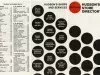 Tri-folded Hudson's Store Directory for their downtown Detroit location. The directory contains sections both for "Hudson's Upstairs Store," and "Hudson's Budget Store. The former lists departments beneath the headings "for men," "for children," "for women," "for boys," "for girls and teens," " for the home," "miscellaneous," and "customer service." The budget section is divided into "for women," "for men," "for boys," "for girls and teens," "for children 2-6," "for infants, toddlers," "for the home," and "miscellaneous." The cover is printed with a design of three uneven rows of black dots against a white background, with a red dot beside the title. The pattern is continued onto the back panel with "Hudson's Shops and Services," listed inside of the circles.