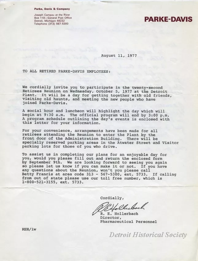 Address list for retirees of Parke-Davis as of September 9, 1977. Sourced from Communications Services' mailing strips. Includes a program schedule, and an invitation letter from R. E. Hollerbach, Director of Pharmaceutical Personnel. Wood grain cover.