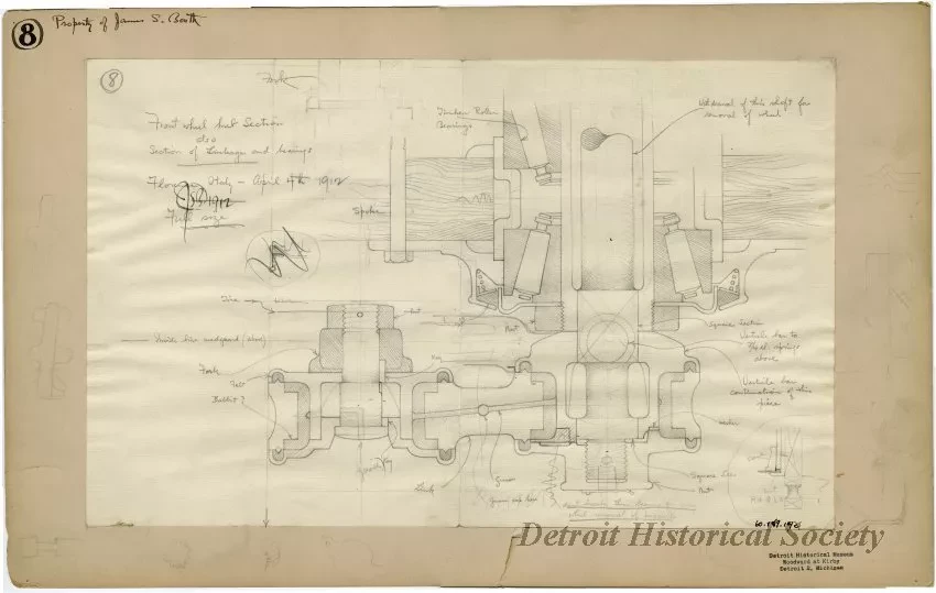One pencil drawing (Sheet 8 of 20) showing a crossection view of the front wheel hub of the "Biautogo" motorcycle. The drawing shows design notes and component labels. It is signed "Florence, Italy, April 4th 1912, JSB [James Scripps Booth]" near the upper left corner.