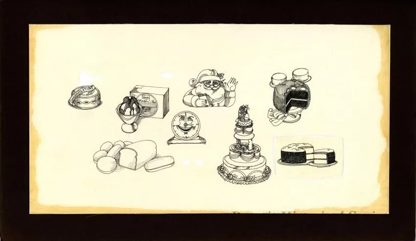 Sanders advertising art which consists of eight black ink drawings on vellum. The drawings include various cakes, ice cream, bread, Santa Claus, and a clock. The artwork is covered with an inner sheet of vellum and an outer sheet of brown paper that fold over from the top.