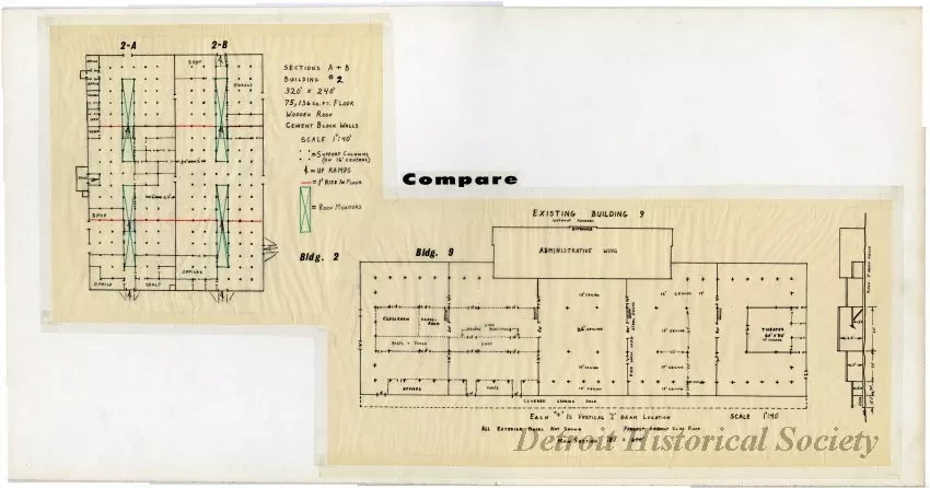 Two drawings on paper, mounted on board, showing a comparison between buildings 2 and 9 on the Fort Wayne grounds, drawn as part of a proposal to transform building 9 into an Industrial History Museum as part of a proposed Fort Wayne restoration project in the mid-1960s. The drawing on the upper left shows sections A and B of building number 2, drawn at a scale of 1":40'. According to the legend, the dots depict support columns, the red lines depict a 1' rise in the floor, and the green Xs depict roof monitors. The lower right drawing depicts building 9 without annexes, also drawn at a scale of 1":40'. According to the legend, each "+" is a vertical "I" beam location. The drawings of both buildings indicate the size of the various sections of the building, along with indications of offices, vaults, shops, storage rooms, class rooms, a loading dock, and a theater.